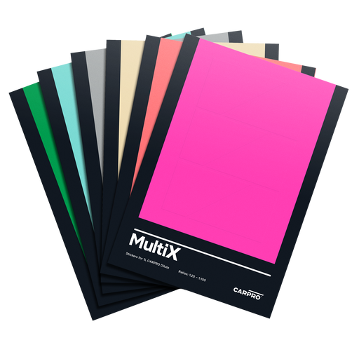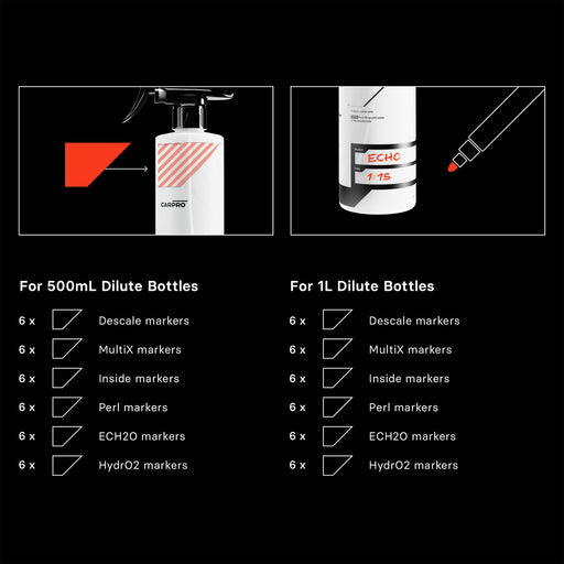 CARPRO Bottle Stickers includes 72 stickers divided over 12 sheets for use on Dilute decant bottles: 6 x Descale (Salmon, 500ml) 6 x MultiX (Brigh...