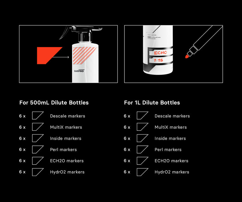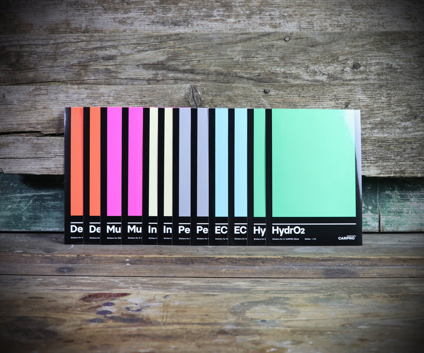 CARPRO Bottle Stickers includes 72 stickers divided over 12 sheets for use on Dilute decant bottles: