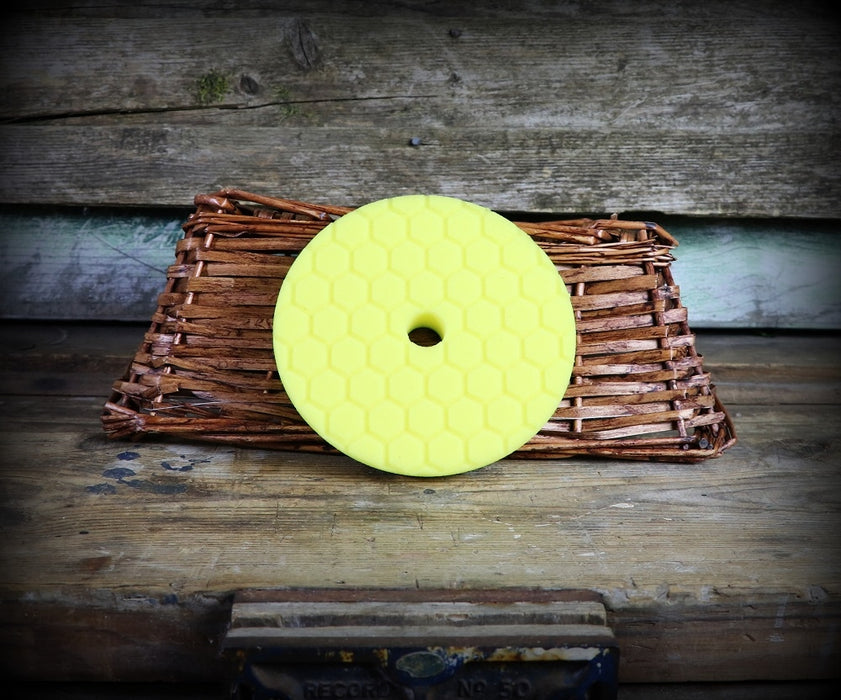 Chemical Guys Yellow Hex Logic Quantum Heavy Cutting Pads are perfect for removing severe swirls, scratches, water spot etching, and oxidation with any dual action or rotary polisher. The heavy cut of Yellow Quantum pads is best reserved as a last resort when lighter Green Quantum pads cannot remove the heaviest and ugliest swirls, scratches, and oxidation. Use Yellow Quantum pads with heavier compounds on any dual action or rotary polisher. Check results for desired effects: if enough defects are removed, move on to finishing polish and white pad; if more cut is needed, consider switching to a microfibre pad or having the panel repainted.