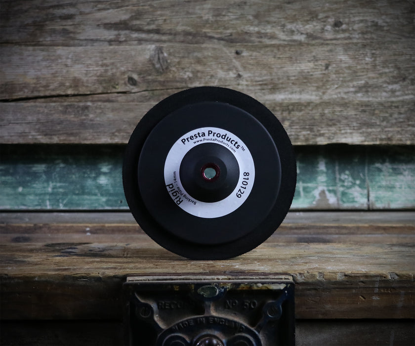 A foam backing plate, designed for use with Presta single-sided wool or foam buffing pads. A Hook & Loop backing plate, with a 14mm thread. Here at Slim's, we understand that the type of backing plate has a tremendous difference on your polishing regime in terms of comfort and control. And we really rate Presta's Rigid Backing plate as it offers a good level of comfort and control when used with a single-sided wool or foam buffing pad.