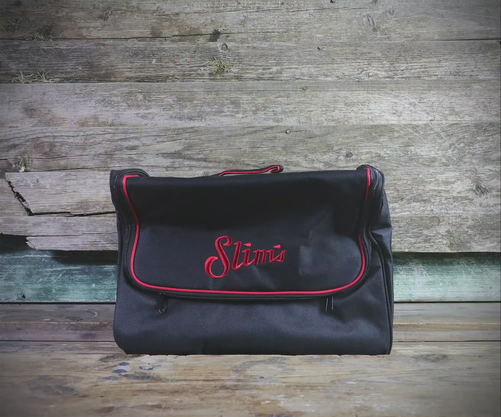 This Slim's embroidered bag is a detailing bag designed to carry your favourite products and your machine polisher. The size of this bag makes it a perfect fit in the boot of your car for show weekends, with the ability to securely store your machine polisher for corrections on the go. The bag can hold up to 6 500ml bottles securely with two large pockets to fit your favourite bottles, waxes, and cloths.